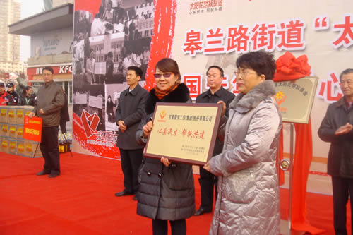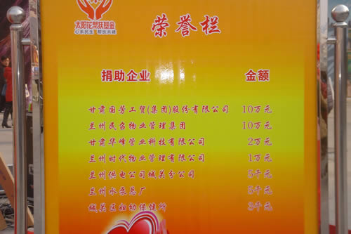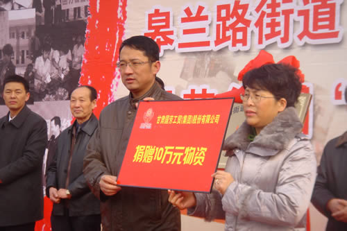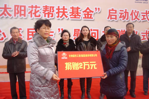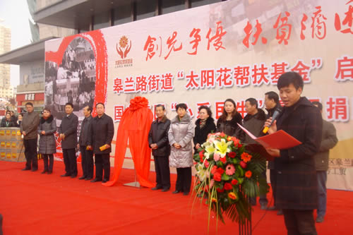 2012元月6日下午3時(shí),甘肅國芳集團(tuán)聯(lián)合城關(guān)區(qū)皋蘭路街道黨工委、辦事處舉行了“創(chuàng)先爭優(yōu)、扶貧濟(jì)困”太陽花幫扶基金啟動儀式,充分體現(xiàn)民生為本的服務(wù)宗旨,著力搭建社會幫扶救助平臺,切實(shí)解決弱勢群體實(shí)際困難,促進(jìn)和諧街道建設(shè)。
