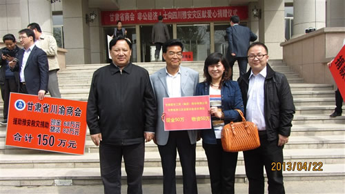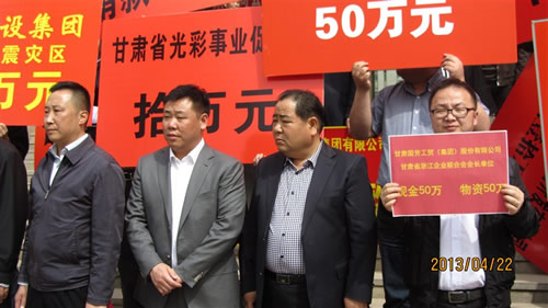 2013年4月22日下午15時,在甘肅省政協(xié)一樓,由甘肅省委常委、省委統(tǒng)戰(zhàn)部部長澤巴足,省委統(tǒng)戰(zhàn)部副部長、甘肅省工商聯(lián)黨組書記、第一副主席吳繼德等相關(guān)領(lǐng)導出席了“甘肅省商會非公經(jīng)濟人士向四川雅安災區(qū)獻愛心捐贈儀式”。捐贈現(xiàn)場眾多甘肅省非公企業(yè)向4月20日雅安市地震災區(qū)進行了捐贈,廣大愛心企業(yè)和人士用自己的實際行動對災區(qū)同胞奉獻了自己的真情和祝福。