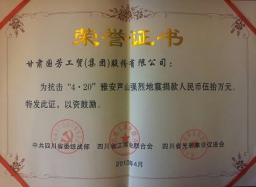 北京時(shí)間2013年4月20日8時(shí)02分,四川省雅安市蘆山縣發(fā)生7.0級(jí)大地震,作為甘肅省知名企業(yè)以及“甘肅省十大慈善單位”,國(guó)芳集團(tuán)在第一時(shí)間向?yàn)?zāi)區(qū)捐贈(zèng)50萬元現(xiàn)金和50萬元的物資,向?yàn)?zāi)區(qū)群眾送去一份愛心,這一善舉得到了廣大社會(huì)輿論的好評(píng)和百姓的良好口碑,并得到了四川、甘肅兩省,省委統(tǒng)戰(zhàn)部、省工商聯(lián)、省光彩事業(yè)促進(jìn)會(huì)的表?yè)P(yáng)和嘉獎(jiǎng)。在此國(guó)芳集團(tuán)呼吁更多的企業(yè)能夠加入社會(huì)公益、慈善的行列里來,讓社會(huì)主義大家庭的溫暖,灑向神州大地,也祝愿雅安同胞早日遠(yuǎn)離苦難,重建家園。