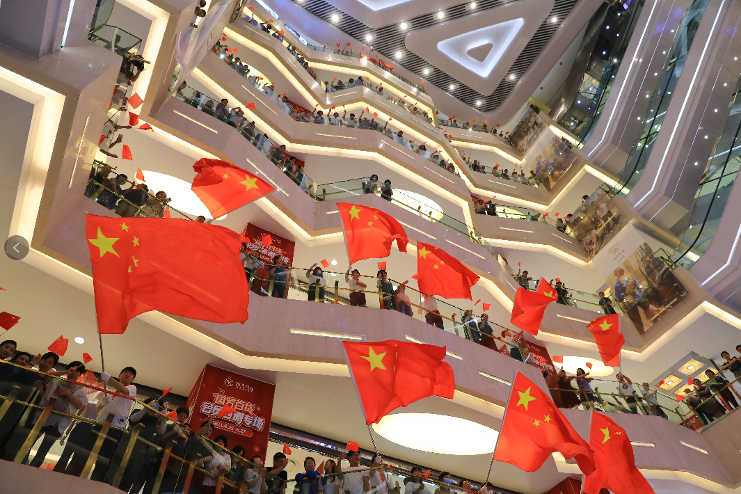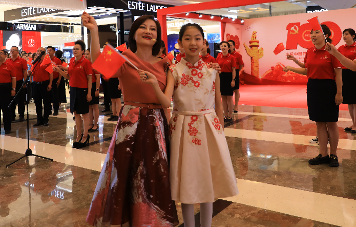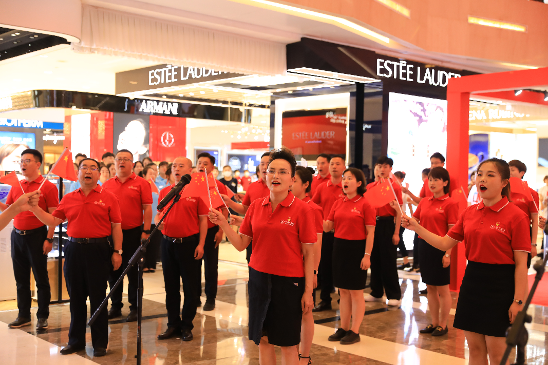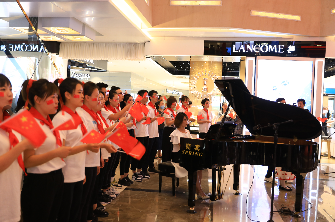 國(guó)芳百貨中廳,隨著鋼琴聲響起,活動(dòng)在男、女領(lǐng)唱“歌唱我們親愛的祖國(guó),從此走上繁榮富強(qiáng)”的歌聲中拉開了活動(dòng)的序幕,30余名國(guó)芳集團(tuán)黨員及員工代表緩緩向主舞臺(tái)走來,大家手持國(guó)旗,組合成“100”字樣,神采奕奕,高聲齊唱。與此同時(shí),現(xiàn)場(chǎng)的圍觀顧客也紛紛加入到隊(duì)伍當(dāng)中,為演出錦上添花。